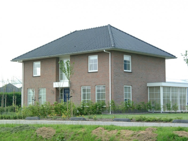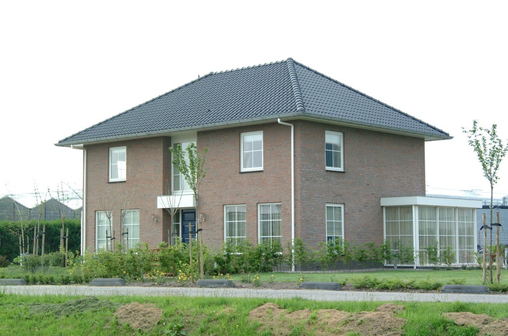 Statig herenhuis met groot dakoverstek. De woning is voorzien van een aanbouw en carport.