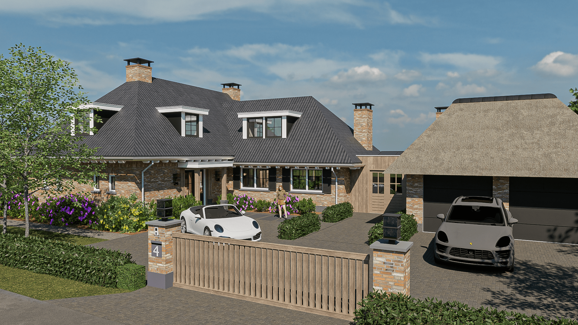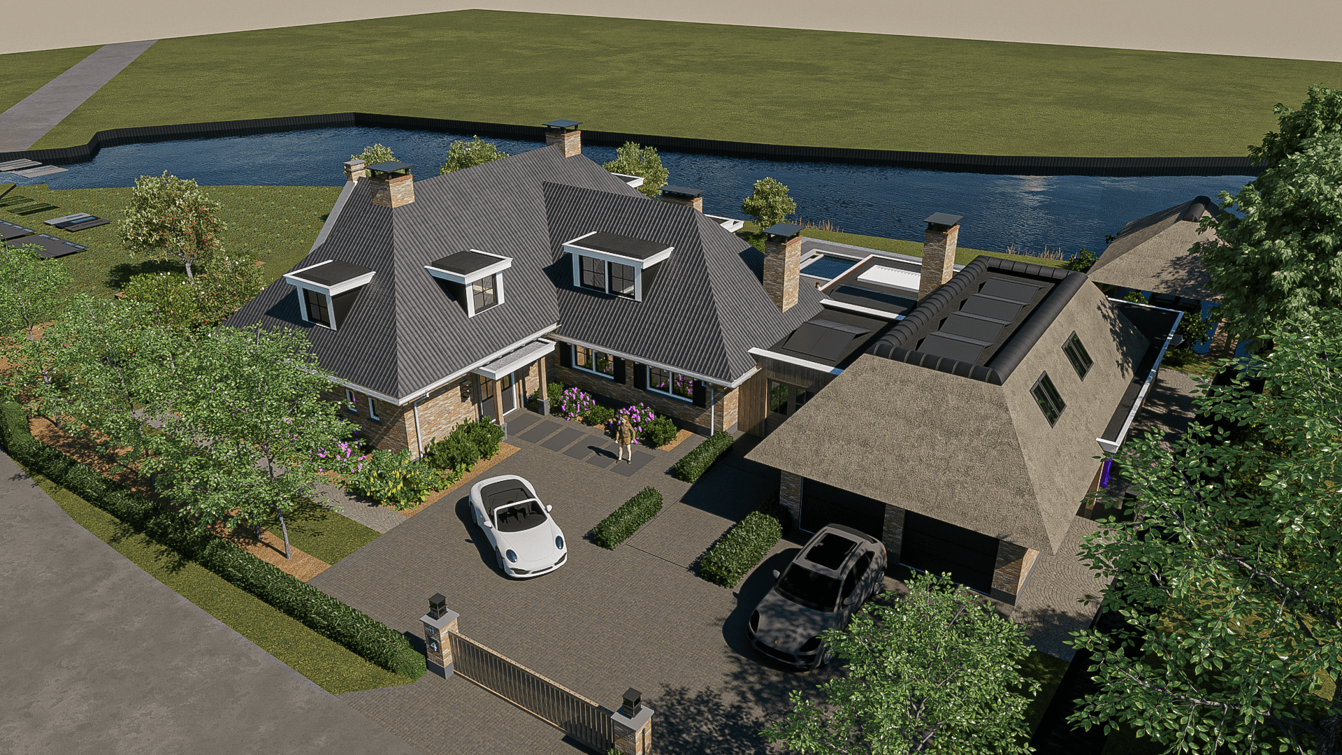 Grote moderne villa, gebouwd met authentieke materialen zoals oude bakstenen en dakpannen. Voorzien van een glazen lift met zicht op oude bakstenen muur. De aangebouwde serre heeft volledig te openen gevels en daklicht voor maximaal licht en ruimtegevoel. In de kelder bevindt zich een wasruimte, sportruimte en een parkeergarage voor 5 auto’s, bereikbaar via een autolift. De garagedeur oogt als een klassieke dubbele deur, maar is uitgevoerd als sectionaaldeur. De tuin biedt een royaal zwembad en aan het water ligt een rietgedekt boothuis op massief eiken constructie compleet met bootlift.