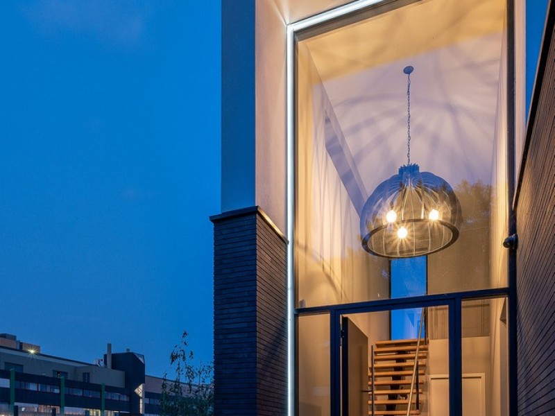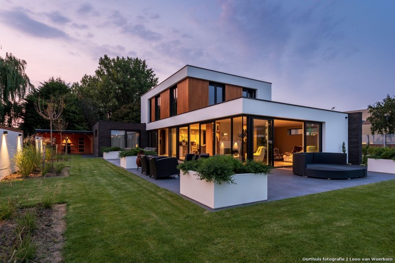 Moderne, vrijstaande villa gelegen aan het water en tussen het groen. Het witte gevelstucwerk en de grote raampartijen combineren geborgenheid en transparantie. De getrapte opbouw wordt versterkt door het contrasterende materiaal. Zo is de begane grond in donkere langformaat stenen uitgevoerd en is de terugspringende verdieping van wit stucwerk en hout voorzien. De royale entree die door beide bouwlagen heen schiet, is een echte blikvanger en fungeert tevens als geluidsbuffer naar de weg.