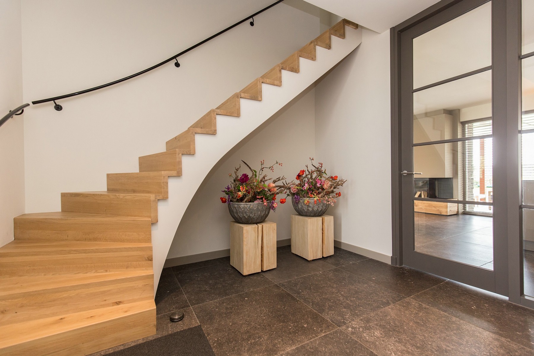 De statige modern-klassieke villa is gelegen aan de rand van een klein natuurgebied. De opbouw van de villa ontleent haar statige, robuuste karakter aan de hoog opgetrokken gevels, de grote overstekken en de robuuste schoorsteen aan de achterzijde. Modern door de combinatie van het witte stucwerk met de donkere gevelsteen.